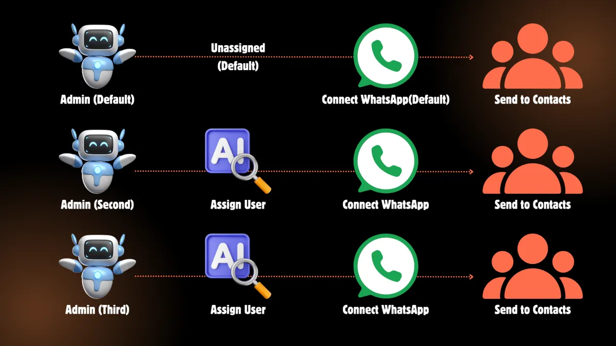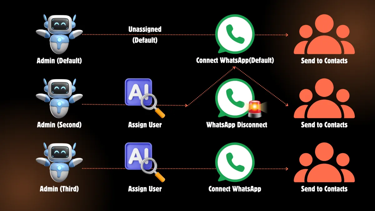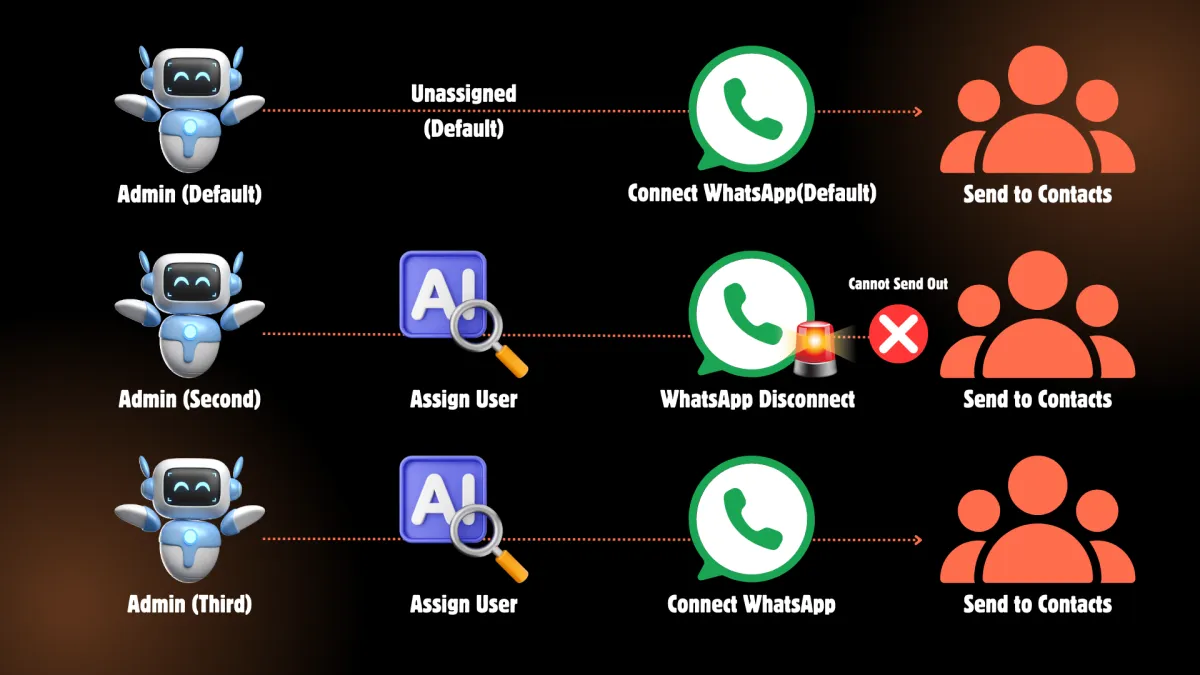 只有各自Admin可以操作各自的WhatsApp如:换WhatsApp账号,链接该WhatsApp账号