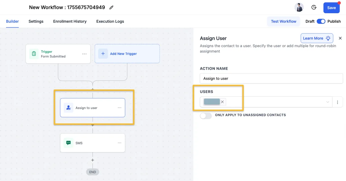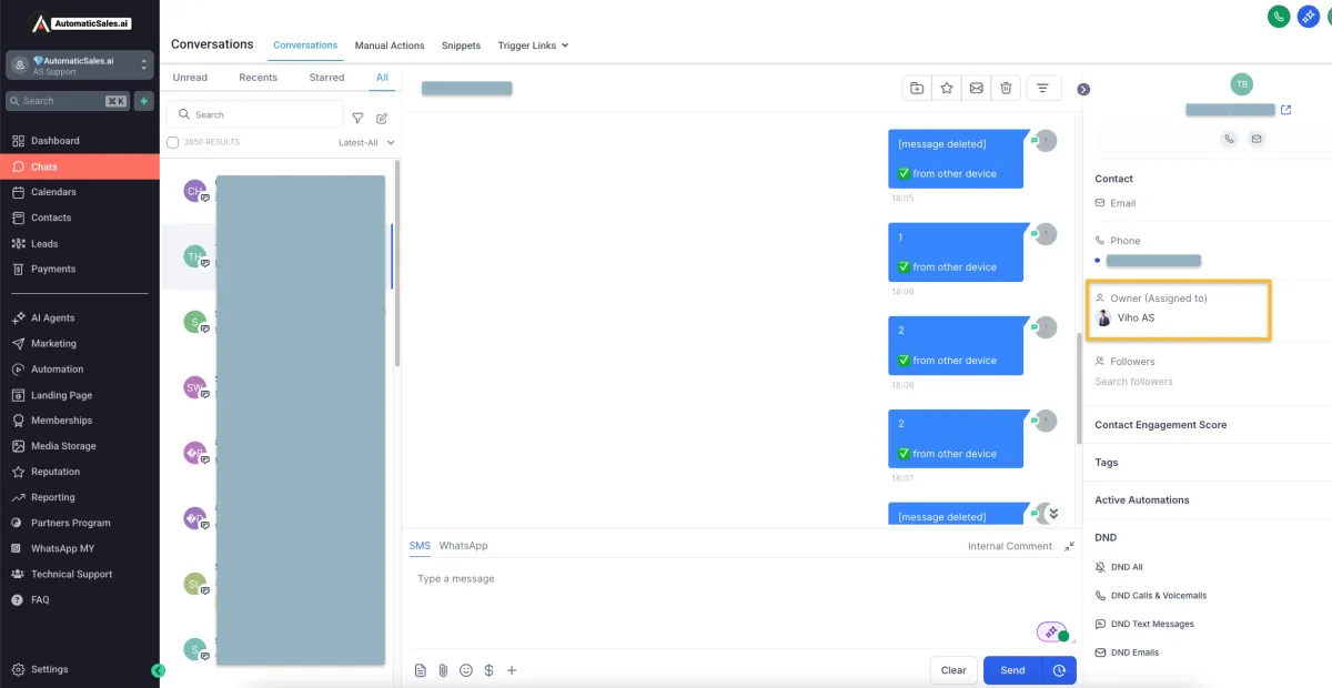 到Automation里,在“SMS”前加上"Assign User"到该Admin以确保信息是从该Admin链接的WhatsApp发送出去